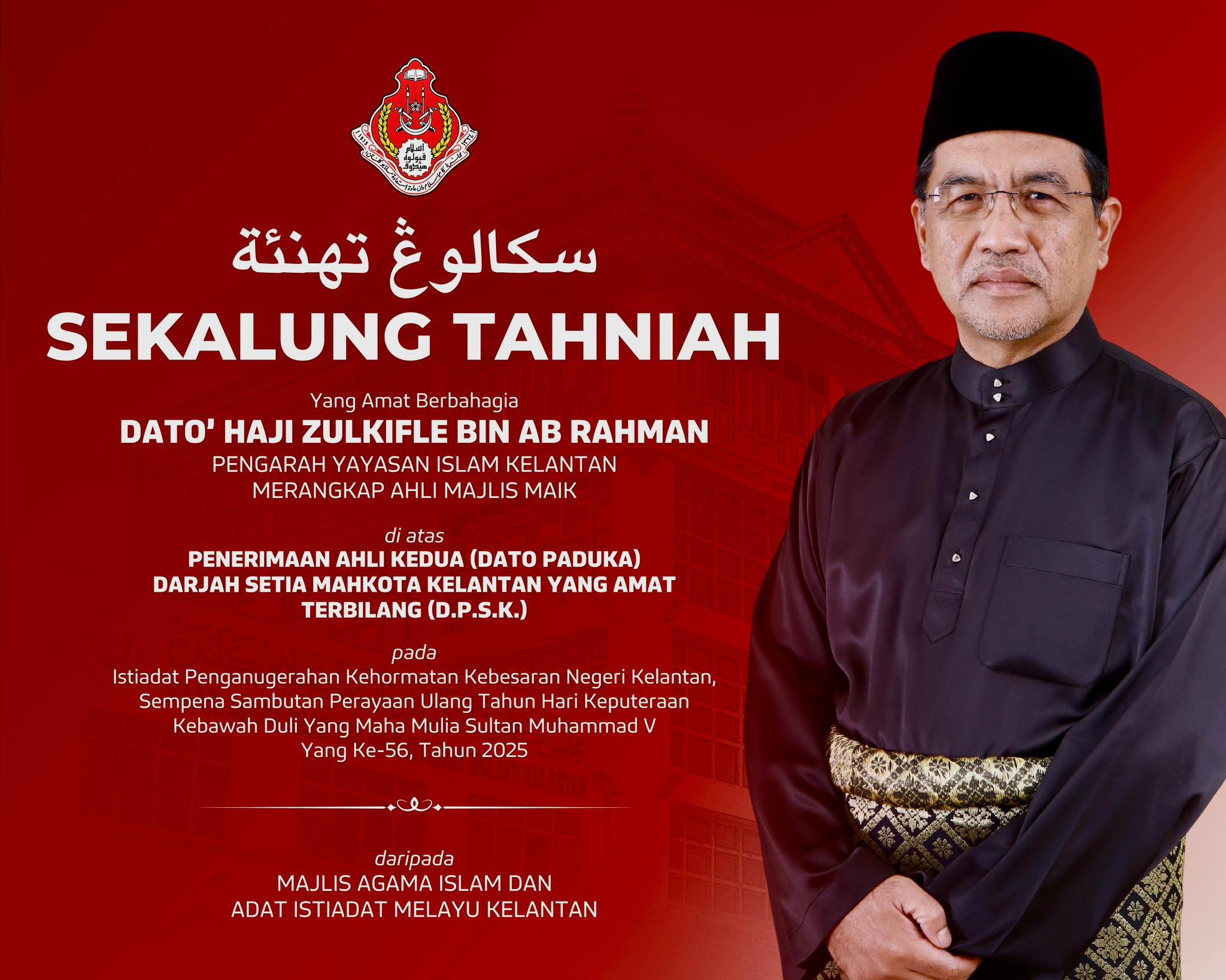 Pada Istiadat Penganugerahan Kehormatan Kebesaran Negeri Kelantan bersempena Sambutan Perayaan Ulang Tahun Hari Keputeraan Kebawah Duli Yang Maha Mulia Sultan Muhammad V Yang Ke-56, Tahun 2025.