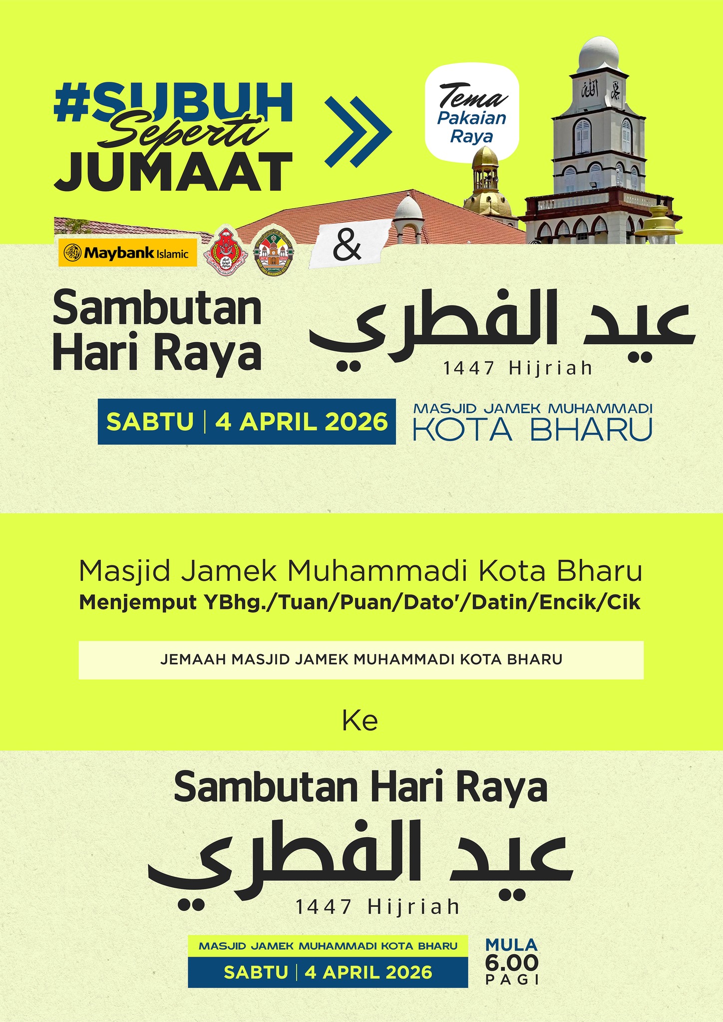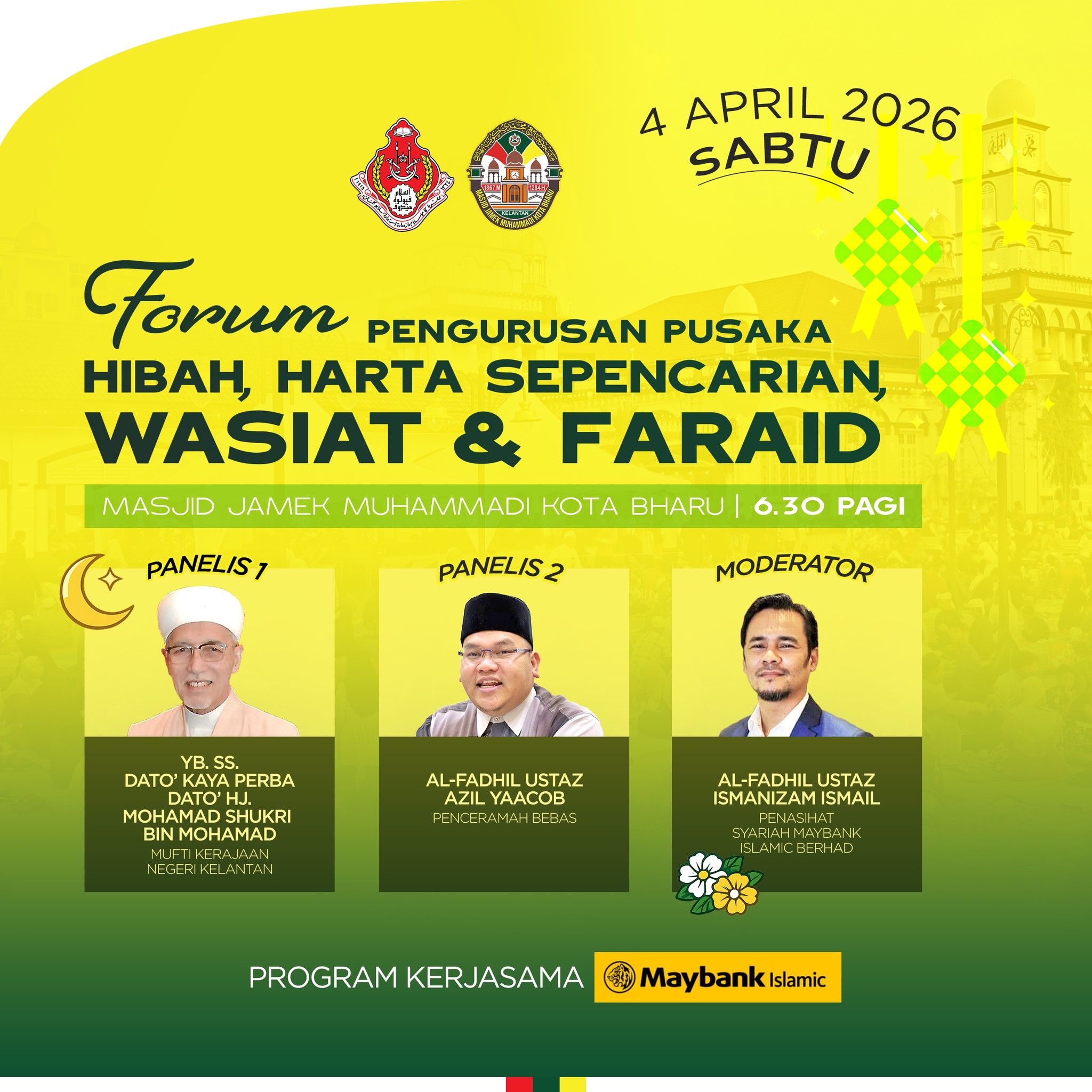 Semua yang ingin ke Majlis Raya Masjid Jamek Muhammadi Kota Bharu pada Sabtu ini, diminta hadir seawal Subuh deh. Barulah terealisasi Masjid sebagai tempat solat berjemaah dan menimba ilmu. Forum Pengurusan Pusaka Hibah, Harta Sepencarian, Wasiat & Faraid dibawakan oleh Maybank Islamic Berhad. Jamuan Hari Raya akan diadakan selepas forum. Dijemput hadir beramai-ramai.