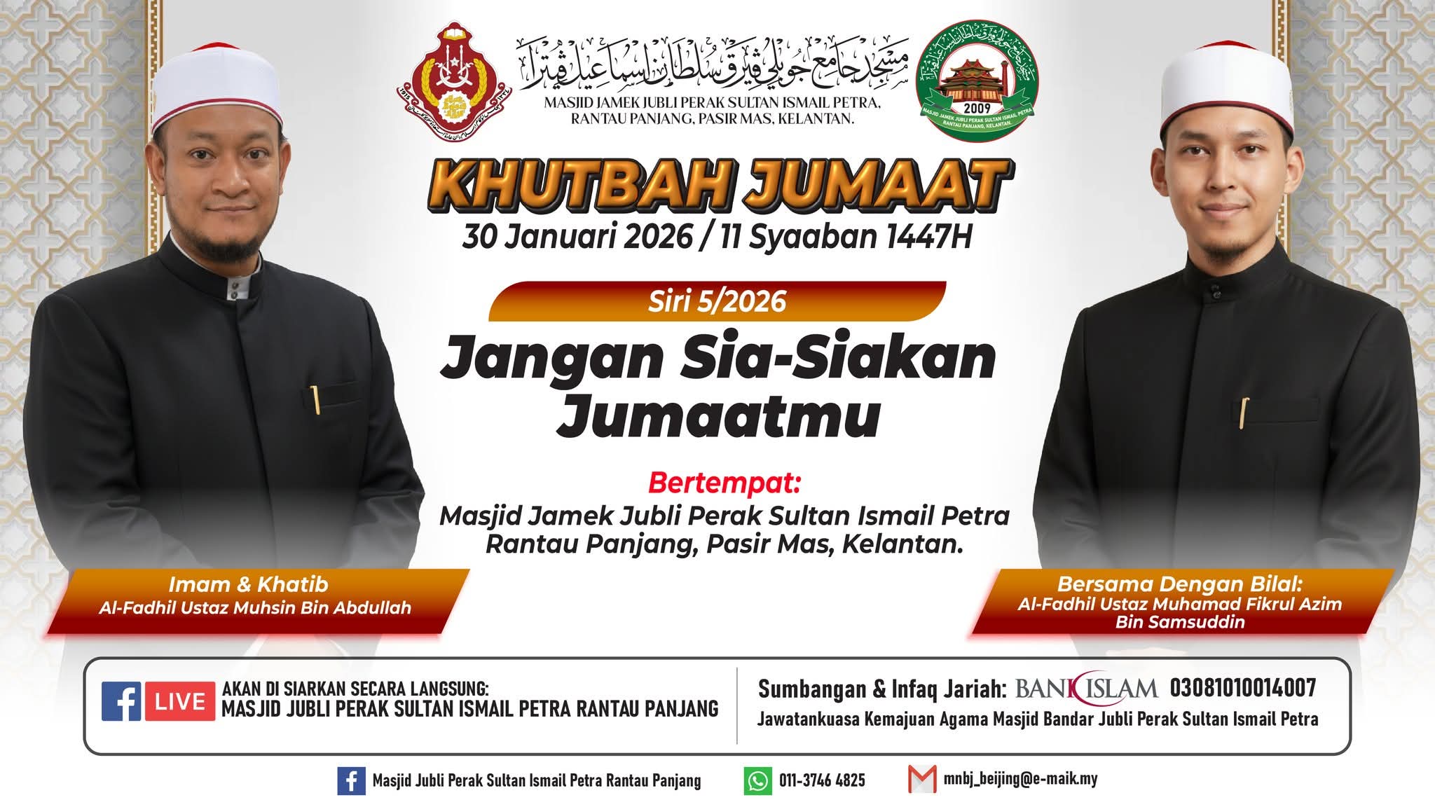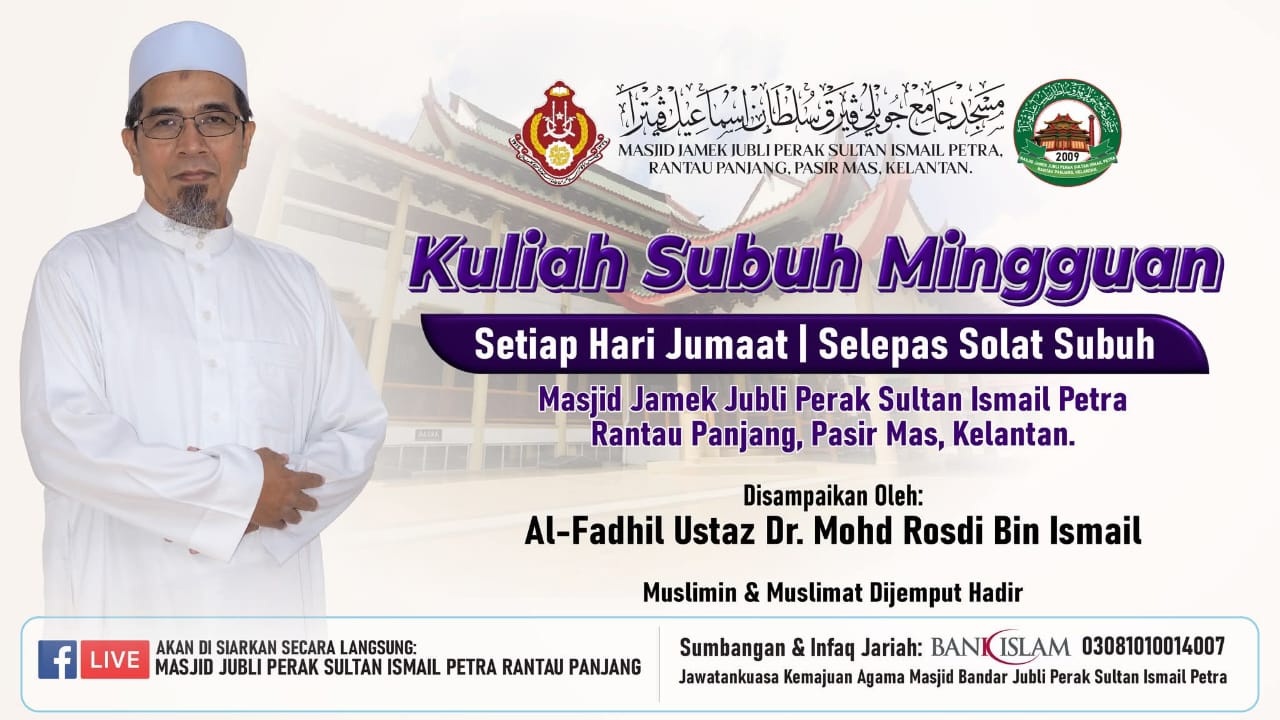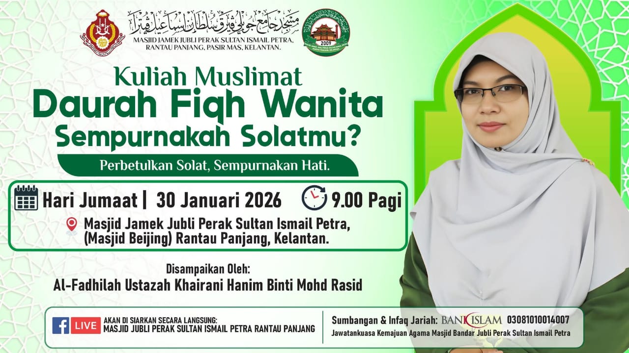 π MAKLUMAN KHUTBAH JUMAAT π π Masjid Jamek Jubli Perak Sultan Ismail Petra Rantau Panjang, Pasir Mas, Kelantan π Tarikh: Jumaat, 6 Februari 2026 π Bersamaan: 18 Syaaban 1447H π Tajuk Khutbah (Siri 6/2026): π₯ Pembakaran Terbuka Membawa Kemudaratan Besar π Imam & Khatib: Al-Fadhil Ustaz Mohamad Arif Bin Suhaimi π€² Bersama Bilal: Al-Fadhil Ustaz Muhammad Fikrul Azim Bin Samsuddin π‘ Akan disiarkan secara langsung (LIVE) π Facebook: Masjid Jubli Perak Sultan Ismail Petra Rantau Panjang Semoga khutbah ini menjadi peringatan dan pedoman buat kita semua dalam menjaga amanah terhadap alam, masyarakat dan kesejahteraan bersama πΏ β¨ Muslimin dijemput hadir. π Silakan kongsikan agar lebih ramai mendapat manfaat.