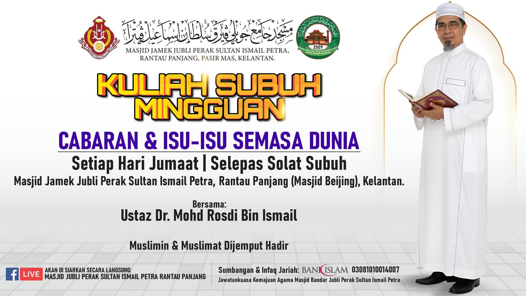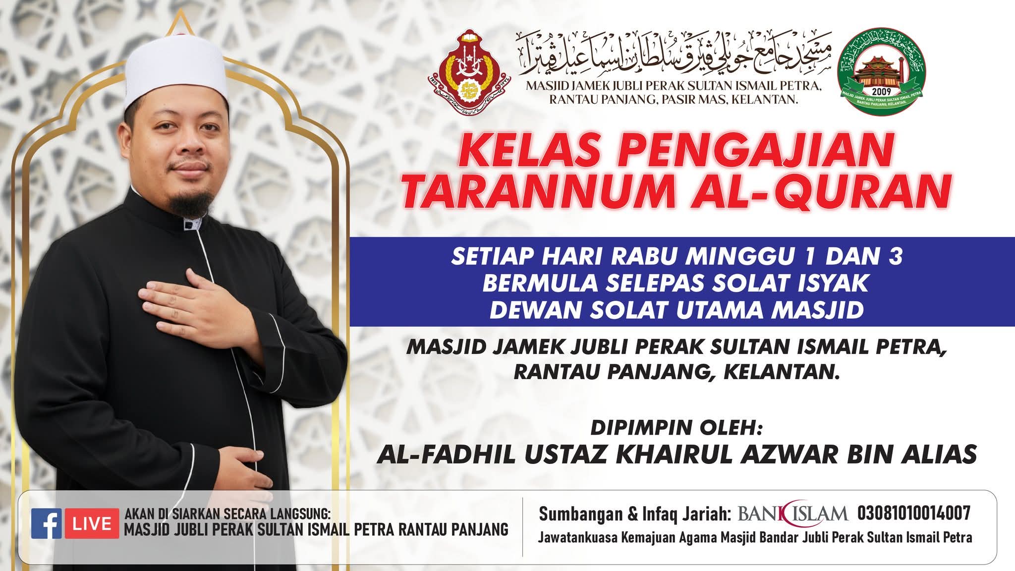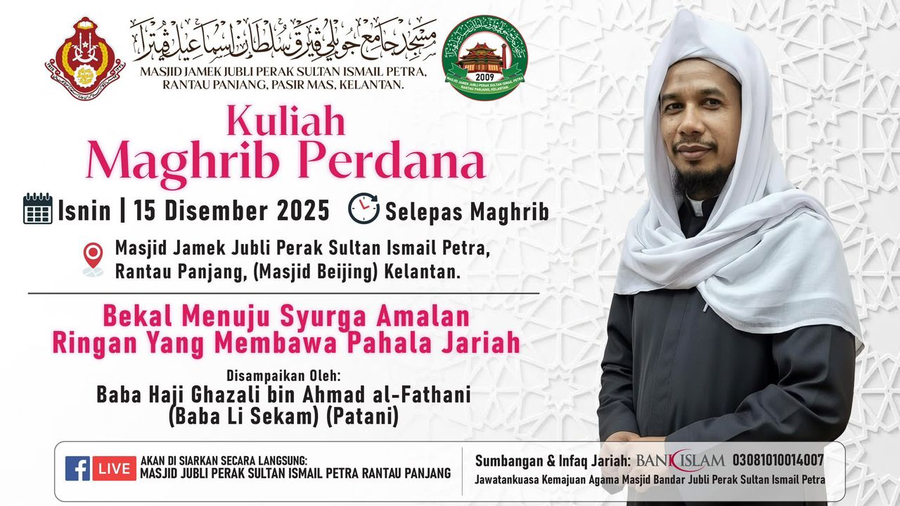 MAKLUMAN & JEMPUTAN RASMI Dengan segala hormatnya dimaklumkan bahawa Masjid Jamek Jubli Perak Sultan Ismail Petra, Rantau Panjang, Kelantan akan mengadakan Kelas Pengajian Tarannum Al-Quran seperti ketetapan berikut: π Hari: Setiap Hari Rabu Minggu 1 dan 3 β° Masa: Bermula selepas Solat Isyak π Tempat: Dewan Solat Utama Masjid π³ββοΈ Penyampai: Al-Fadhil Ustaz Khairul Azwar bin Alias Sehubungan itu, seluruh jemaah dan masyarakat setempat adalah dijemput hadir bagi bersama-sama mengimarahkan majlis ilmu ini. Diharapkan pengajian ini dapat memberikan manfaat serta meningkatkan kefahaman dan penghayatan terhadap seni bacaan Al-Quran. π Sumbangan & Infaq Jariah boleh disalurkan ke: Bank Islam | 03081010014007 (Atas nama: Jawatankuasa Kemajuan Agama Masjid Bandar Jubli Perak Sultan Ismail Petra) Kerjasama dan kehadiran tuan/puan amatlah dihargai. Sekian, terima kasih.