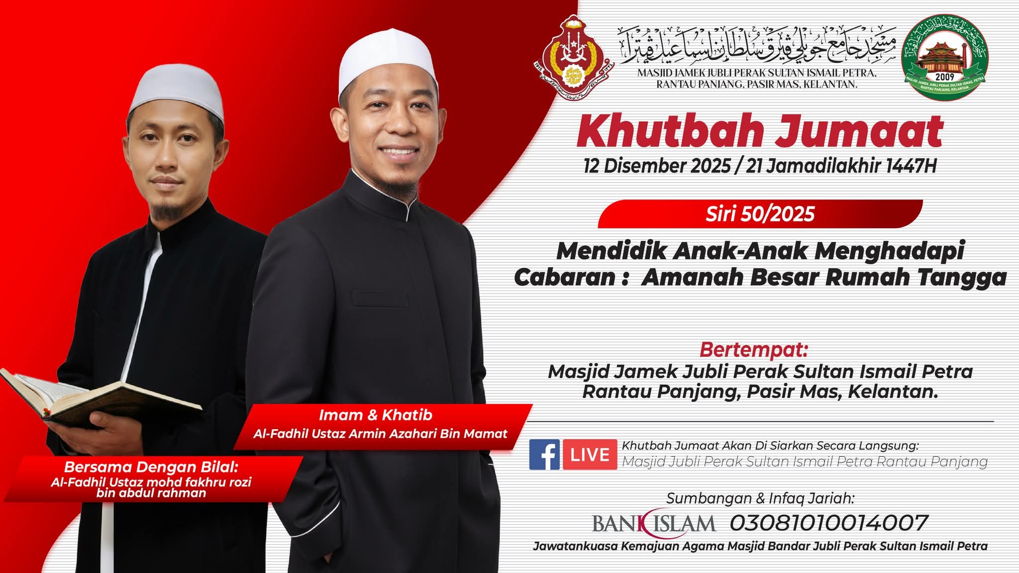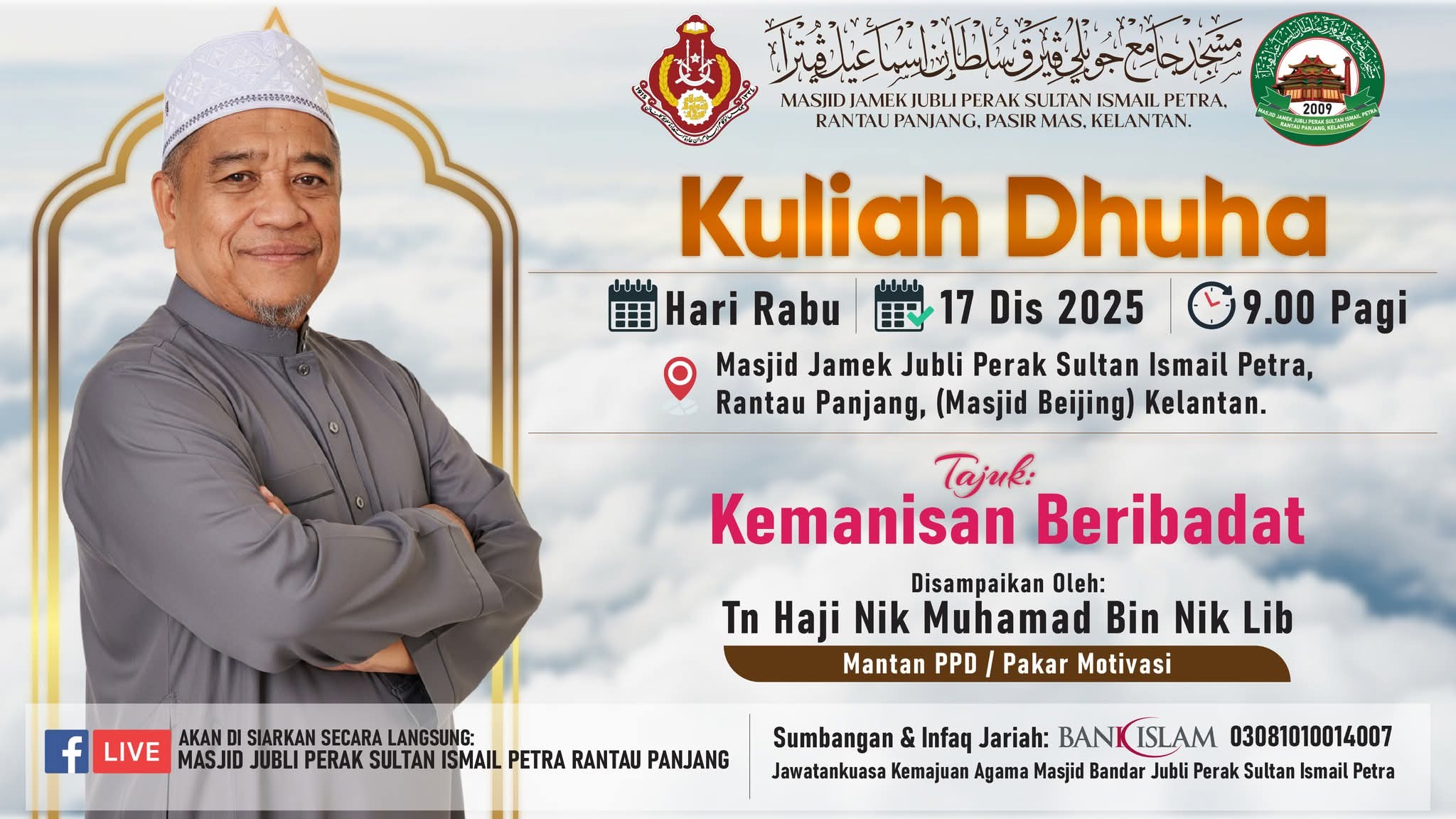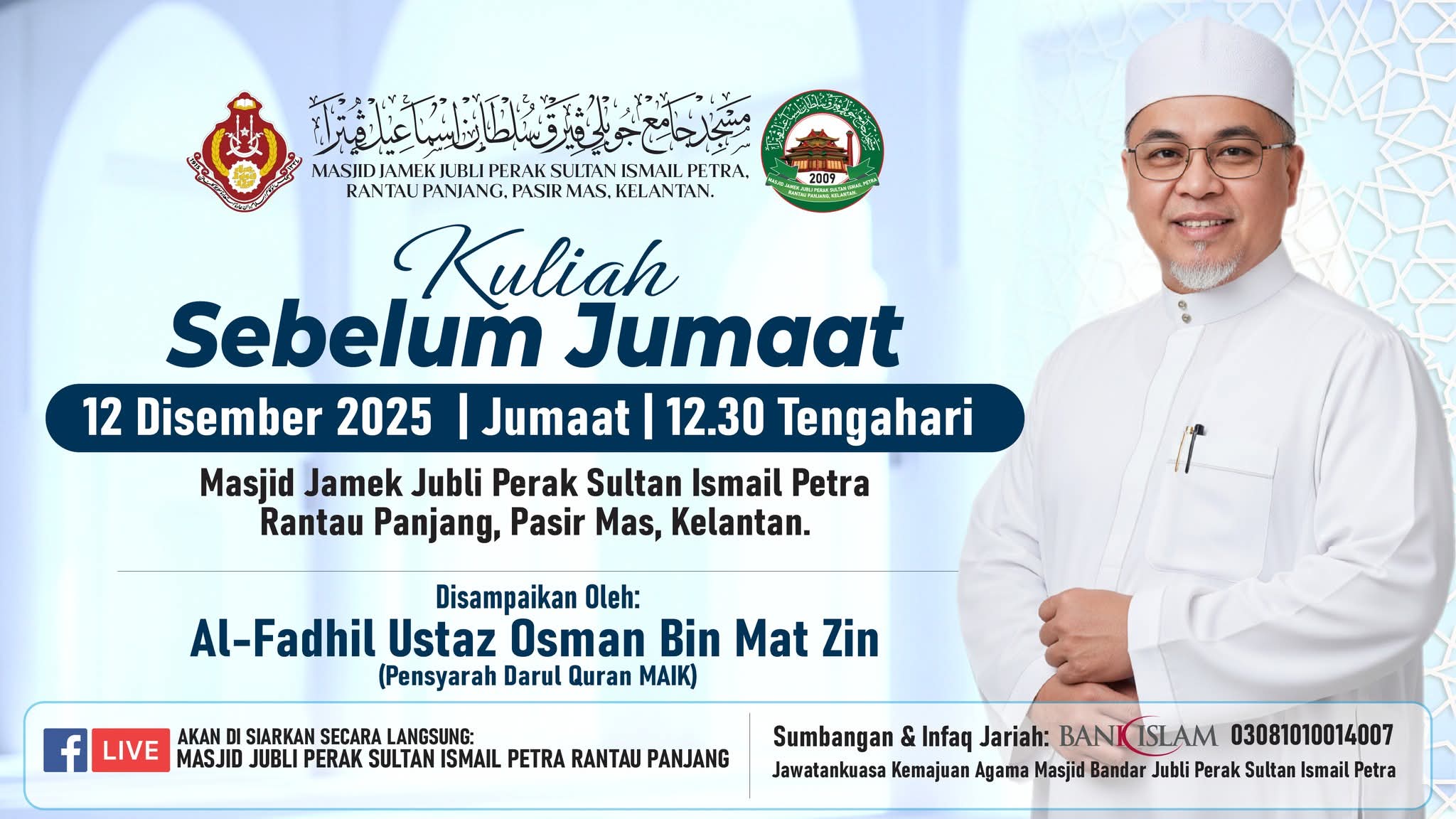 MAKLUMAN & JEMPUTAN RASMI Dengan segala hormatnya dimaklumkan bahawa Masjid Jamek Jubli Perak Sultan Ismail Petra, Rantau Panjang, Kelantan akan mengadakan Kelas Pengajian Tarannum Al-Quran seperti ketetapan berikut: π Hari: Setiap Hari Rabu Minggu 1 dan 3 β° Masa: Bermula selepas Solat Isyak π Tempat: Dewan Solat Utama Masjid π³ββοΈ Penyampai: Al-Fadhil Ustaz Khairul Azwar bin Alias Sehubungan itu, seluruh jemaah dan masyarakat setempat adalah dijemput hadir bagi bersama-sama mengimarahkan majlis ilmu ini. Diharapkan pengajian ini dapat memberikan manfaat serta meningkatkan kefahaman dan penghayatan terhadap seni bacaan Al-Quran. π Sumbangan & Infaq Jariah boleh disalurkan ke: Bank Islam | 03081010014007 (Atas nama: Jawatankuasa Kemajuan Agama Masjid Bandar Jubli Perak Sultan Ismail Petra) Kerjasama dan kehadiran tuan/puan amatlah dihargai. Sekian, terima kasih.