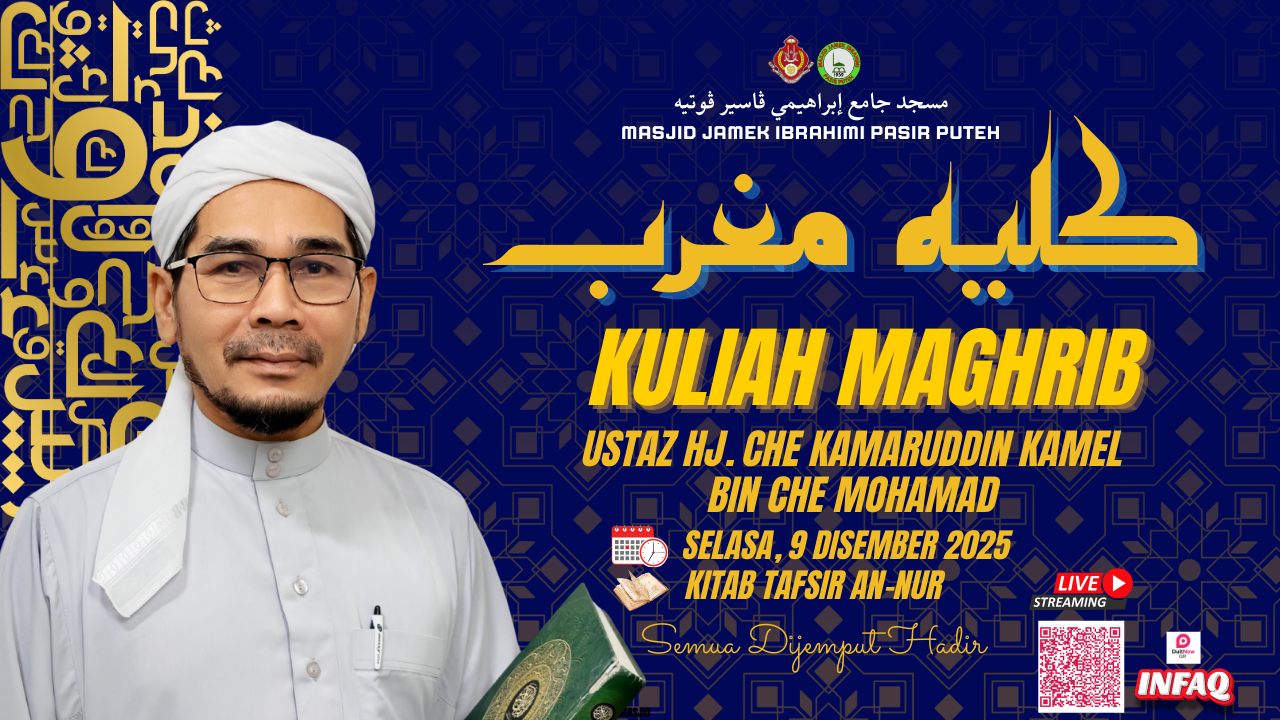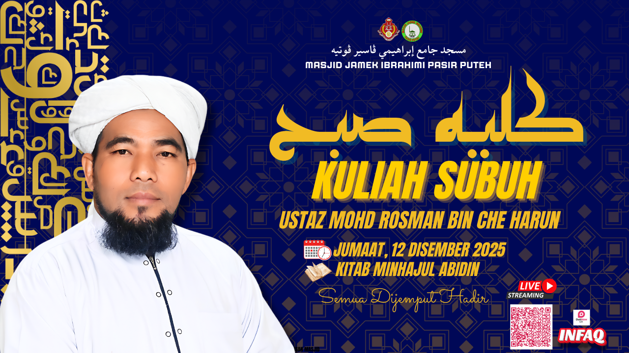 π Kuliah Sebelum Jumaat π« Menambah ilmu, menyubur iman Jemput semua muslimin hadir ke Kuliah Sebelum Jumaat yang akan diadakan seperti berikut: π Tarikh: 12 Disember 2025 (Jumaat) π° Masa: 12.30 tengah hari π Tempat: Masjid Jamek Jubli Perak Sultan Ismail Petra, Rantau Panjang, Pasir Mas, Kelantan. π Disampaikan oleh: Al-Fadhil Ustaz Osman bin Mat Zin (Pensyarah Darul Quran MAIK) π‘ Siaran Langsung di Facebook: Masjid Jubli Perak Sultan Ismail Petra Rantau Panjang π€² Sumbangan & Infaq Jariah: Bank Islam | 03081010014007 Jawatankuasa Kemajuan Agama Masjid Bandar Jubli Perak Sultan Ismail Petra π¬ Mari bersama menimba ilmu, menghidupkan masjid, dan meraih keberkatan hari Jumaat. #KuliahJumaat #KuliahSebelumJumaat #MasjidJubliPerakSultanIsmailPetra #CintaMasjid #BankIsla#KuliahJumaat #KuliahSebelumJumaat #MasjidJubliPerakSultanIsmailPetra #CintaMasjid #BankIsla#berwaspadaterhadapsifatlalaim #RantauPanjang #PasirMas #Kelantan #JomKeMasjid #TazkirahJumaat #MajlisIlmu #InfaqJariah #MasjidMalaysia #UstazOsmanBinMatZin #DarulQuranMAIK #IlmuDanAmal #PahalaBerpanjangan #JumaatBarakah #HidupkanMasjid #IlmuUntukSemua